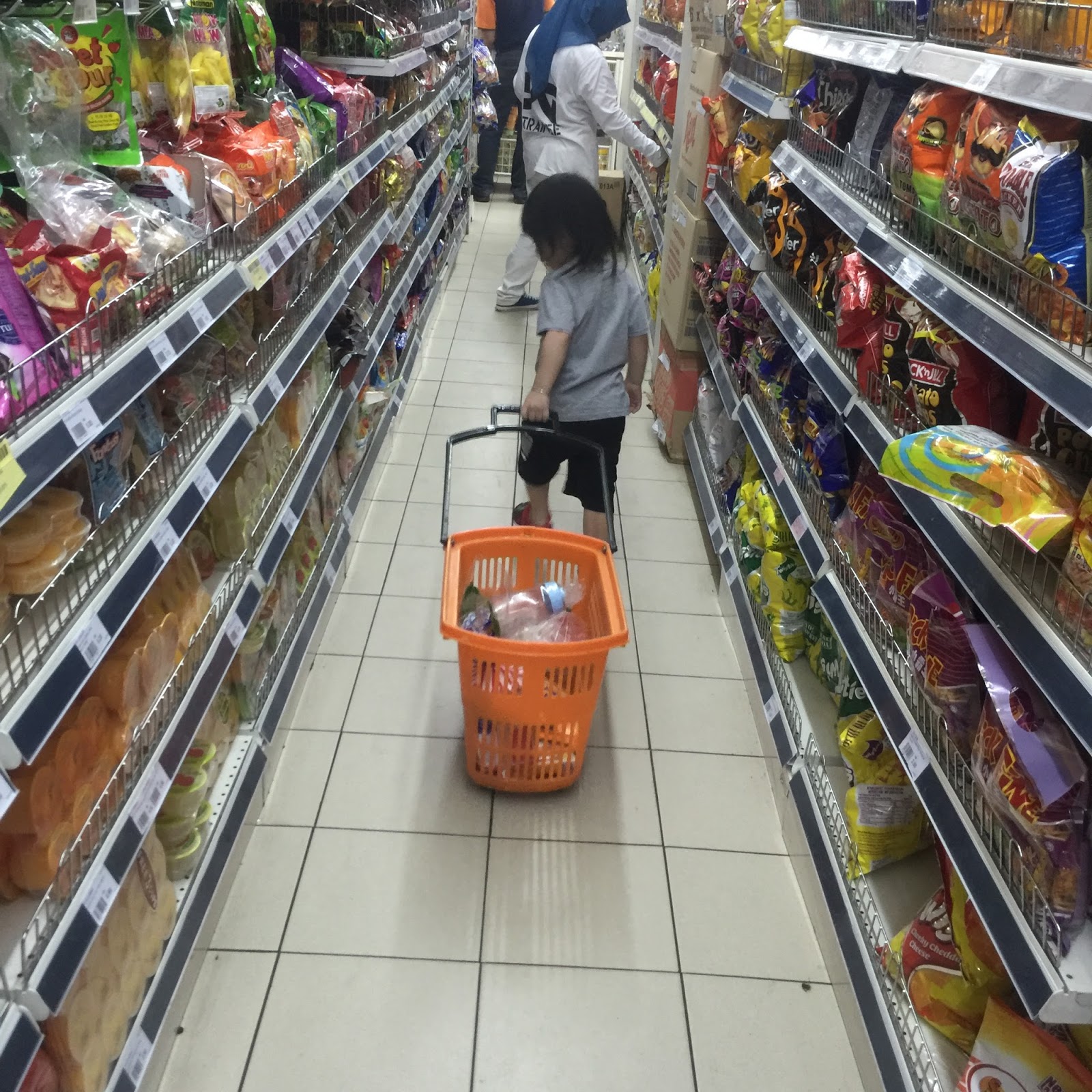 Kami shopping groceries kat MyMYDIN belakang umah je. Yang paling excited Azriel lah, pertama kali dia keluar tanpa stoller. Terkejut jugak dia sebab dia asek tanya mana stroller dia. So mommy said today adik "free Stroller"ok?.. So jejalan pimpin tangan OMG so sweet dah besar anak aku. Masuk je MyMYDIN laju-laju grab bakul. Mula-mula dia nak tolak trolley tapi troley tu tinggi dan besar afterward aku ganti dengan bakul ni. Punya dia excited. Siap bagitahu. "mommy takyah ngang! adik buat!"hahahah. anak aku memang dah big-big boy sangat.